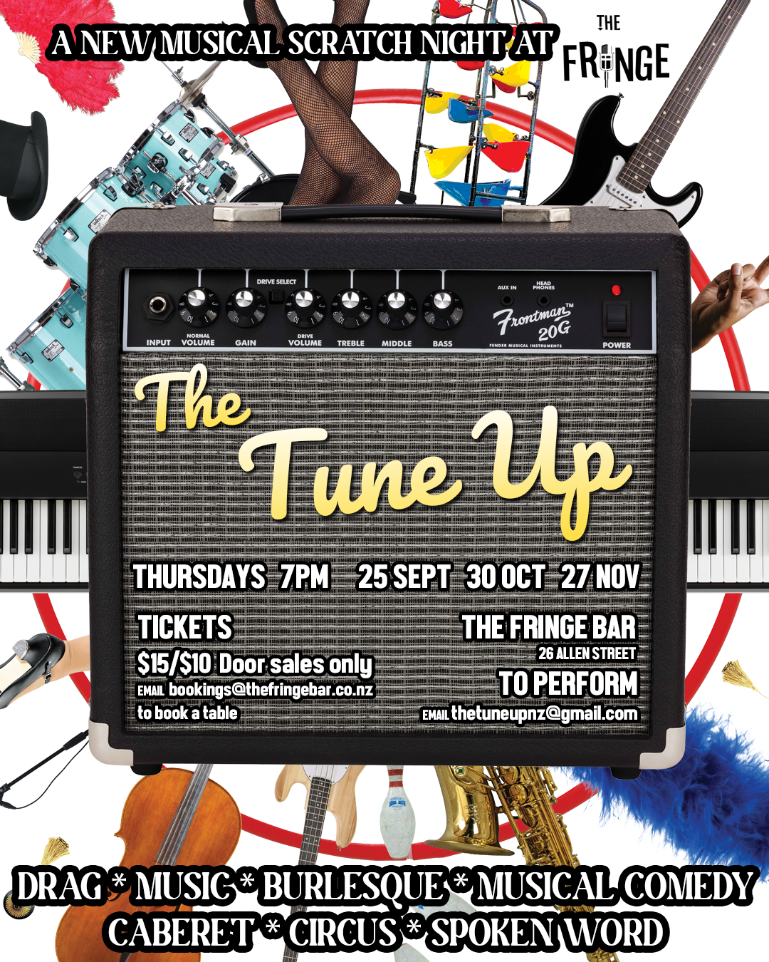 The Tune Up is a monthly musical scratch night that runs at the awesome Fringe Bar - Allen Street in central Whanganui-a-Tara just off Courtney Place. Hosted and run by Dr. Blue and Ms. Weeds, It exists to provide stage time for artists to try out new material, experiment with show sets or encore existing work. Sets lengths are from 3-10minutes but we can be flexible. There is no fee, this is meant to be our performance lab! We curate the night, so if you want to perform please send for an EOI request to:
